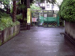 「行き止まり」の看板の目の前に、階段と、右に向かう道がある。